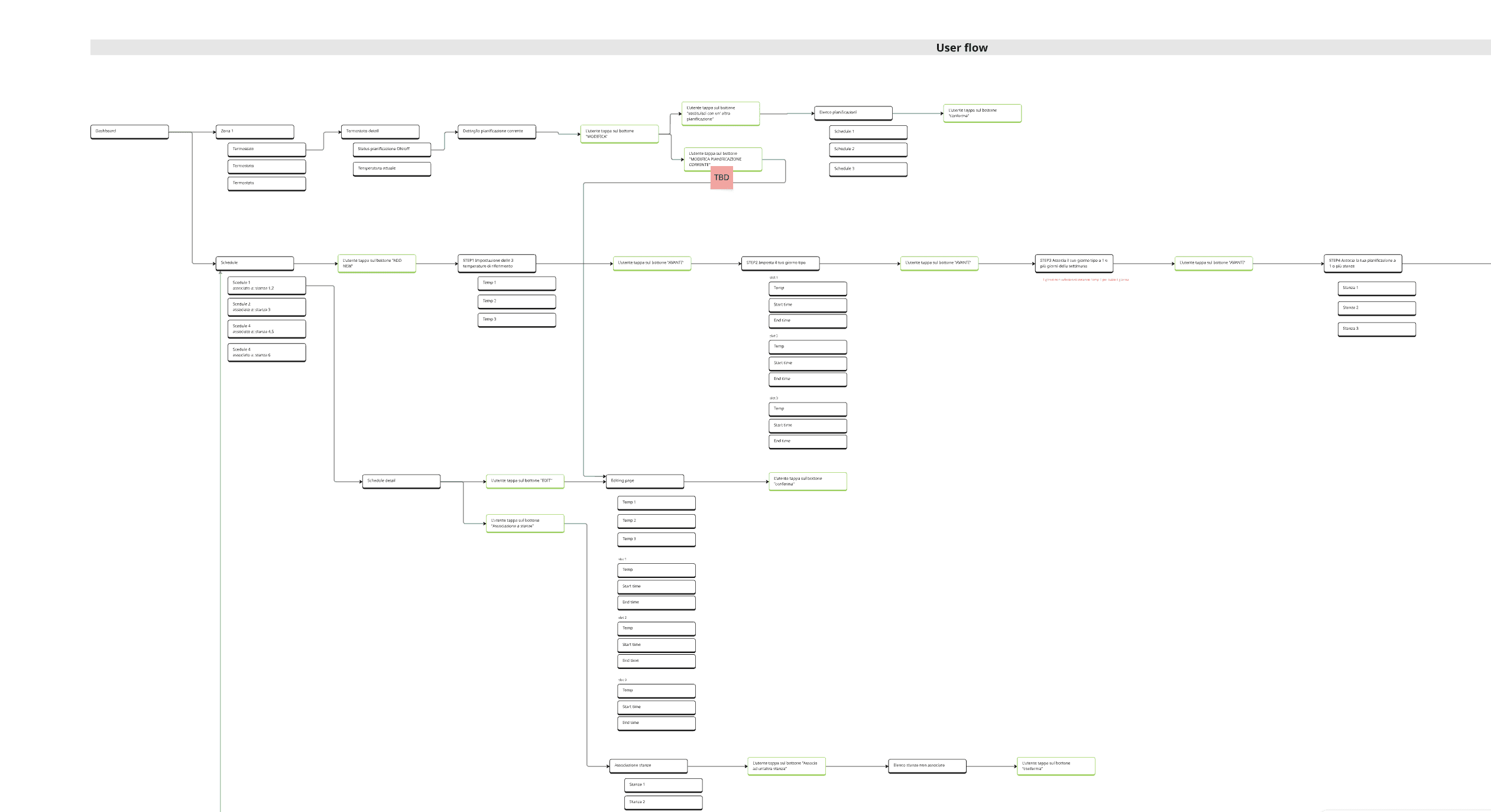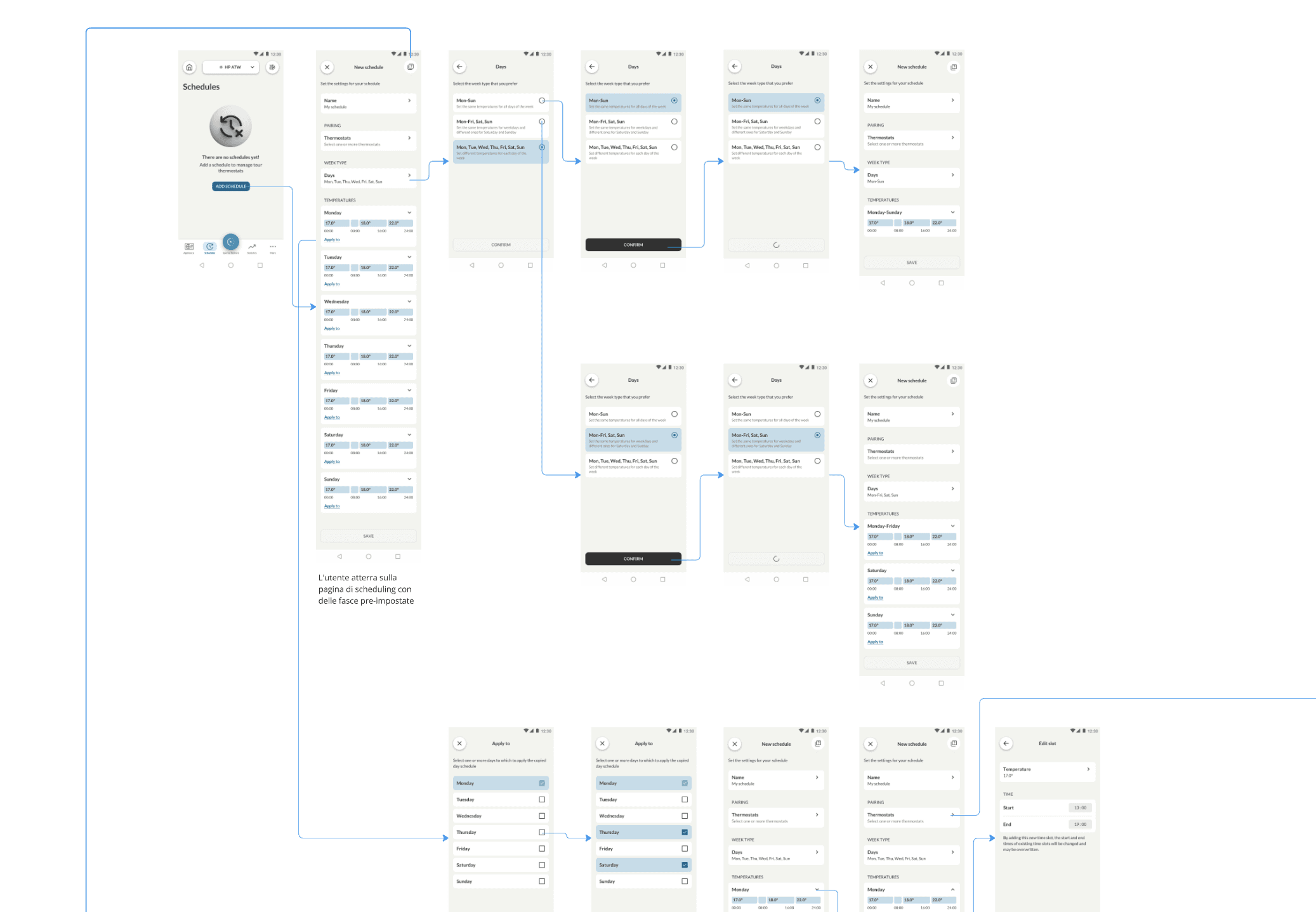 We began by defining the complete user flow for the ATW scheduling feature. During this phase, it became clear that the number of variables and technical limitations of the ATW appliance introduced a level of complexity that could easily overwhelm users.