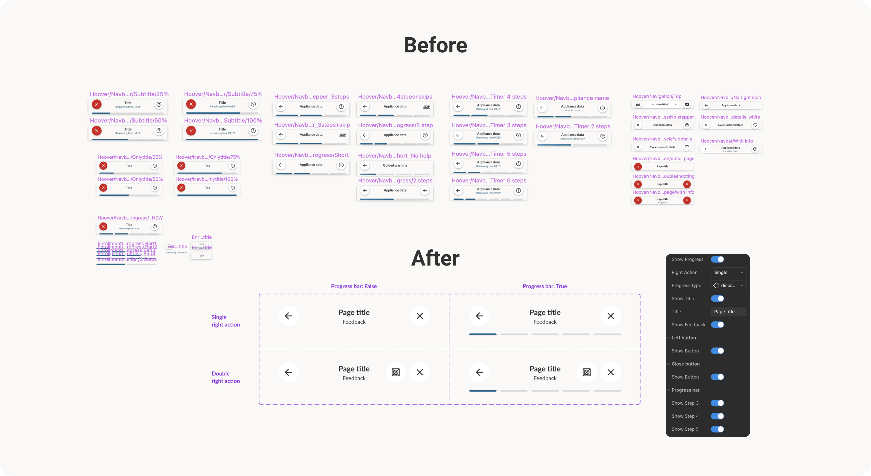We streamlined redundant patterns by consolidating fragmented components into scalable, flexible foundations. For example, the navigation top bar, once split into dozens of inconsistent versions, was restructured in Figma as a single base component.